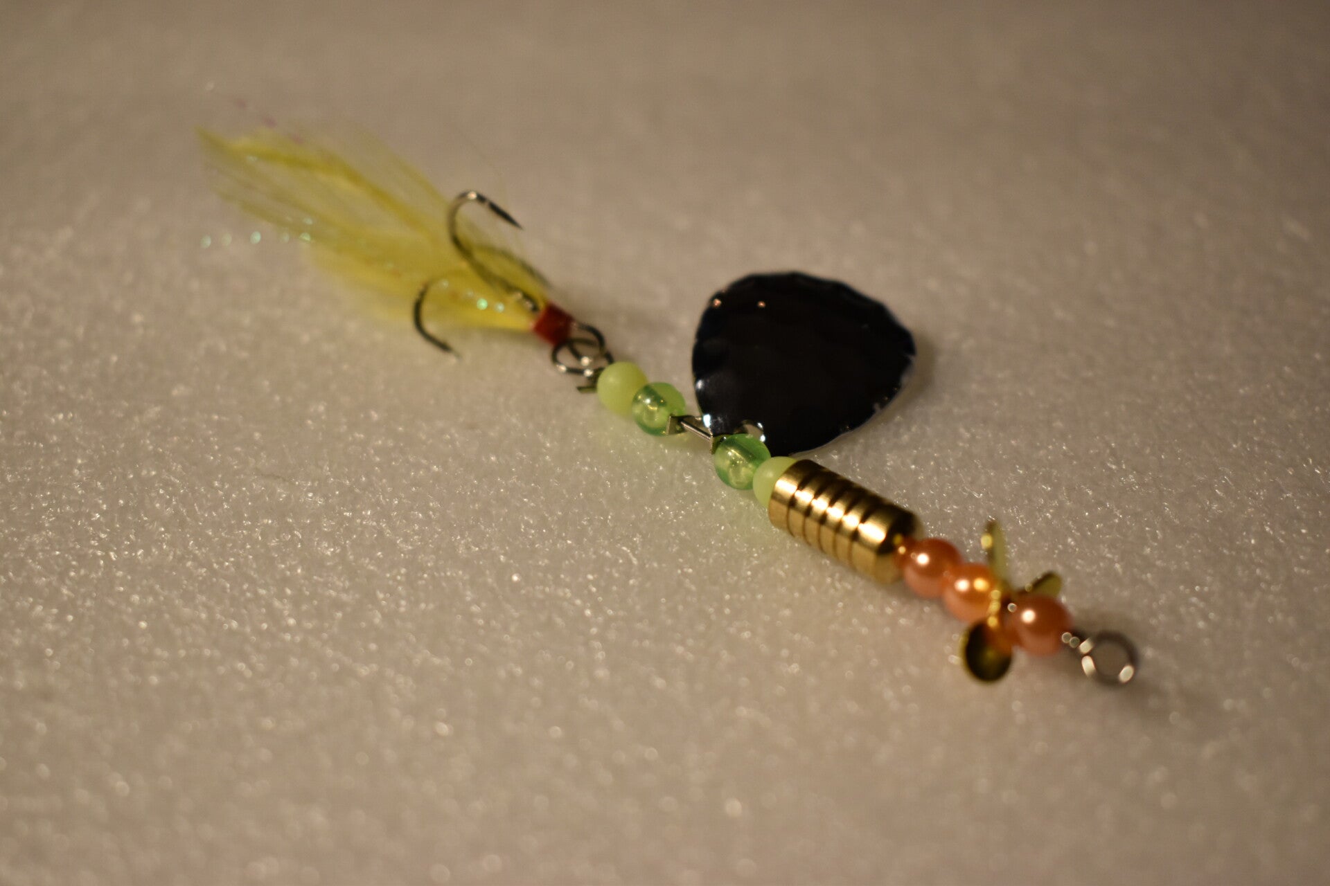 EJ’s Morning Glow Spinner shines just like the first light of dawn, making it an irresistible choice for fish in both clear and stained waters. The bright yellow feather tail creates lively, fluttering action that mimics small baitfish, while the green and peach bead combination adds a warm, sunrise-like glow that grabs attention from a distance.